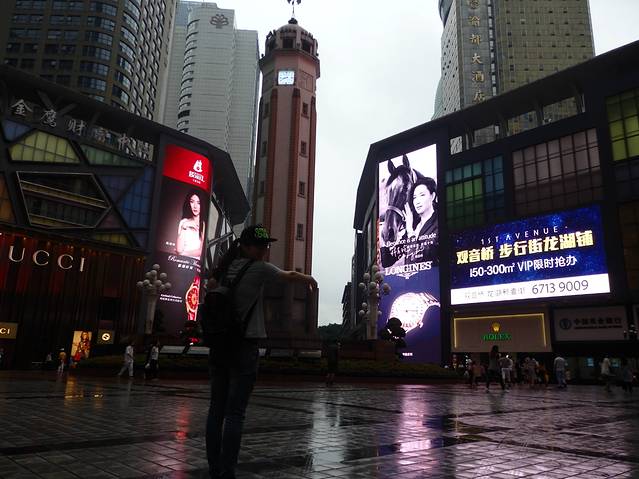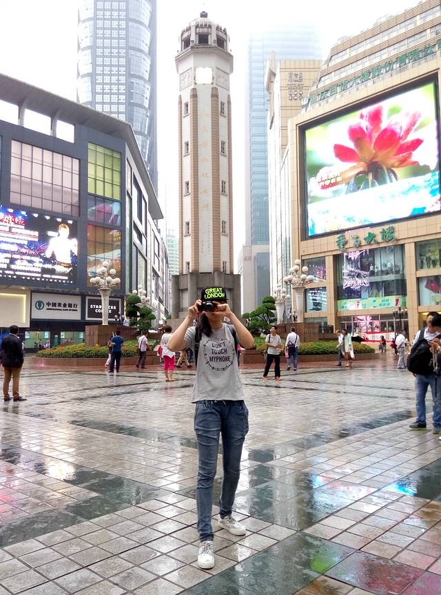 第二天,早起,外面下起了小雨,有点小冷,穿件外套正合适。今天的行程很满,是暴走的一天。因为我们住的地方离解放碑很近,所以第一站就选择去那里。一路走,一路问,各种晕头转向的来到了解放碑。据说解放碑是老重庆最高的建筑物。现在却被各种高楼大厦层层围在中间。解放碑是重庆很著名的一条商业街,也是一个看重庆妹子的好地方。当然,解放碑附近高楼林立的大厦也是看花了我的眼。个人觉得在解放碑看看,拍拍就可以结束行程了。因为那边各种大牌、奢侈品遍地,不适合穷游学生党。