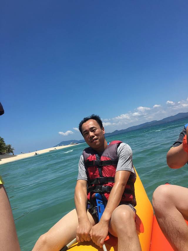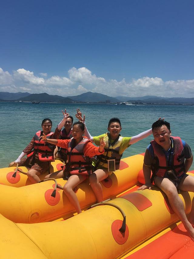 今天是疯狂的一天,因为我们要去玩海。懒人原则就是路近方便,我们的选择就是西岛---近在咫尺的海洋天堂。西岛就是西玳瑁岛,形似玳瑁,这是离三亚市区最近的离岛,交通方便,虽然和三亚市区近在咫尺,但因为有海水相隔,污染比市区的海边要小的多,沙滩柔和,海水清澈,空气清新,风景特别秀丽。被海水包围,被三亚湾环抱的西岛,水阔潮平,是开展海上运动的天堂。摩托艇、拖曳伞、海钓、香蕉船、皮划艇……,让我们这些人都能各得其所,满足我们对纵横海上的憧憬。我们坐了一日游的车子,顺利地来到西岛,坐着游船到了岛上,我们选了香蕉船、飞鱼、拖曳伞这几种游乐项目。一直以为香蕉船是最不刺激的项目,六人坦然地坐上香蕉船,开心、喧闹、毫不在乎,突然风云突变,我们坐在香蕉船上由一艘快艇以50公里/小时以上的时速拉着在海上飞驰,随着海浪的起浮,香蕉船犹如一匹脱缰的骏马自由穿梭在碧蓝的大海之中。紧张、刺激、忐忑不安,两手紧握着缰绳,身怕一不小心,就腾云驾雾,被甩出去,消失在茫茫大海中。手也握酸了、屁股也坐疼了、嗓子也喊哑了,终于到岸了。接下来就是更骇人的飞鱼,飞鱼船是由一艘高速快艇牵引行驶,速度是香蕉船的几倍。我们坐在飞鱼船上随着海浪的高低起伏,可以感受坐在香蕉船的感觉,当快艇加速时,飞鱼飞离海面,同时又可以感觉坐在一只风筝上感受放飞心灵的乐趣,当船只急转弯时,整个飞鱼会在空中转弯,感受赛车时飘移的刺激,就象小鱼跃出水面,在妩媚的阳光中展示它们美丽的身姿。还好,当天海风不大,快艇师傅手下留情,速度控制了,我们几个就没有在该项目上翱翔蓝天,滑翔大海。因为接下来的拖曳伞,就是满足梦想,放飞希望的时候,拖伞从起飞到降落,一切动作均在海边、海上完成。在海摊上自由起落,在浩瀚无限的天空中随意翱翔,把自己融入碧海蓝天之间,像鸟儿一样在天空中翱翔,此时的心在飞翔,从空中俯瞰全岛,景色更加的迷人。融入大自然,使之烦恼尽抛,心旷神怡。并可蜻蜓点水一至二次,尽享风光。不幸地是限制体重,160以上不能飞,苦逼的我只能仰头流泪羡慕了。更不幸地是,猫二在幸灾乐祸中,降落伞降落时扭伤了脚。
