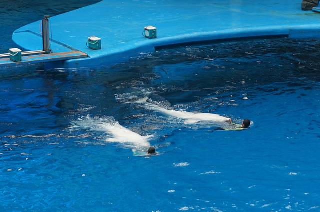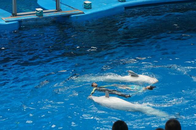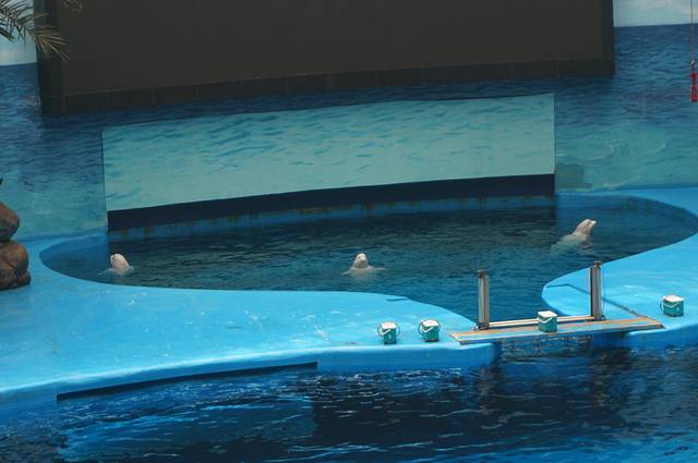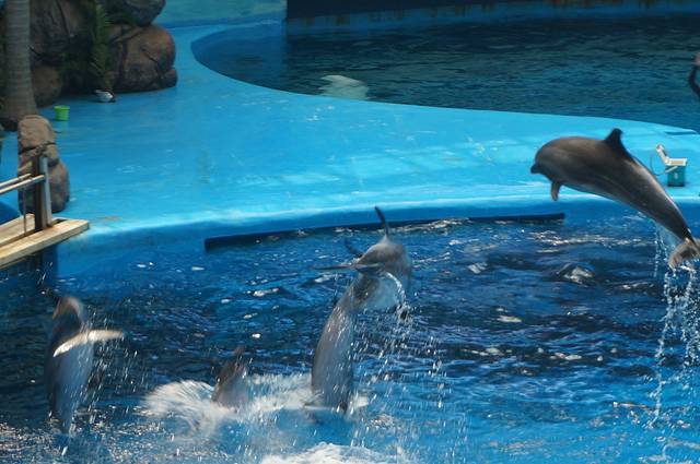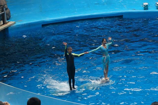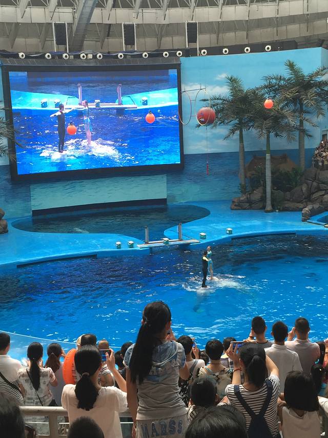 应小帅胖、小萌梦两位小朋友的要求,这一天是属于他们的时间,海洋世界永远是小朋友的最爱。当天一觉睡到自然醒后,我们坐了旅游直通车来到了成都海昌极地海洋世界,这是西南地区排名第一的海洋世界,大小朋友的第一兴趣是看海洋动物表演。一进海洋世界的大门,我们直奔欢乐剧场,还有10分钟,第一场鲸鱼和海豚的表演就要开始了,能容纳千人的看台内座无虚席,国内的海洋世界走了不少,明星海豚的表演是必看的,但如此精彩的鲸豚表演确是难得一见。在美妙的音乐《hero》陪奏下,一男一女两个训练员跳入水池中,两只白鲸伴在左右,它们在水中翻转腾跃,按照驯养员的要求完成各种动作,一切都显得游刃有余,最高潮的部分就是白鲸用头把训练员缓缓升起,一男一女在水面上握手相视,后绕场一周,浪漫至极,整个表演精彩绝纶。接下来的海豚更是嗨遍全场,四只银灰色的海豚,一开场就沿着水池边缘一次又一次地高高跳起又落下,绕场一周,这么劲爆的开场白让全场观众都沸腾了,呐喊声和掌声、尖叫声此起彼伏。伴随着优美动听的音乐,海豚在高空旋转,腾跃,精彩的场面接连不断,高潮迭起,水池边充满了浪漫与神秘的色彩,让人仿佛来到了童话中的海洋世界。接着我们还游览了海龟馆、企鹅展示馆、鲨鱼展示馆、海底观光隧道,近距离地欣赏到各种海洋珍稀动物,让人仿佛置身于真实纯净的极地世界,真是一段神秘奇幻的海底之旅。到了饭点,猫大、猫二、俞先生这三大懒虫就不肯再挪脚了,看着两个孩子纯真、渴望、新奇的眼神,我心软了,拉着两个小屁孩继续玩下去,我们看到了体态臃肿的海狮、身手矫健的海象、憨态可掬的北极熊等可爱的海洋动物。最后两位小朋友还去看了4D电影和体验了摇摇车,真是开心。
