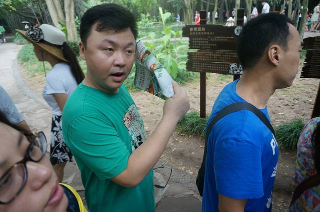 一觉睡到自然醒,我们乘了直通车去游览大熊猫基地。整个大熊猫基地就是一个由竹子构成的超大公园,占地面积达100公顷,里面居说住了120多只大熊猫,还有少量的小熊猫(同样是濒危物种),还有孔雀、黑天鹅。园区很美,园区也很大,懒人们想坐里面的观光车,但是排队的人太多,只得无奈地放弃,只能有选择地参观几个地方。繁育大熊猫的地方叫熊猫产房,大熊猫居住的地方叫熊猫别墅,每个大熊猫都有室内和室外的活动空间,熊均居住面积怎么也得有70-80m²,不愧为国宝级宠物。但我们犯了个错,昨天订票时只顾自己的休息,忘了天气情况,毕竟是夏天,熊猫除了早上出来闲逛一下,就直接进空调室享受了。我们去的太晚了,熊猫们都进屋了,我们转了几个地方都没发现熊猫,正在望眼欲穿时,小帅胖发现一条长龙,仔细端详,才发现人们都在排队看室内熊猫。为了国宝,懒人们也难得正经地排了次队(事实证明这也是在成都的唯一一次排队)。终于我们看到了超可爱的大熊猫和超萌的小熊猫,刚生出来的小熊猫就象小老鼠。小帅胖化身为摄影师了,拍了很多照片。后我们是在玫瑰苑用的中餐,吃了点面条、饺子,不昨的。