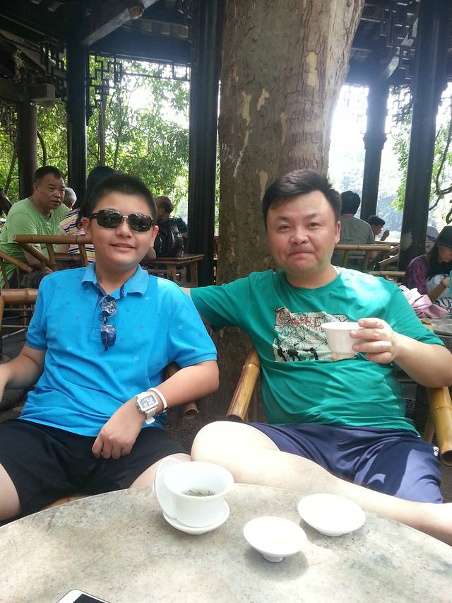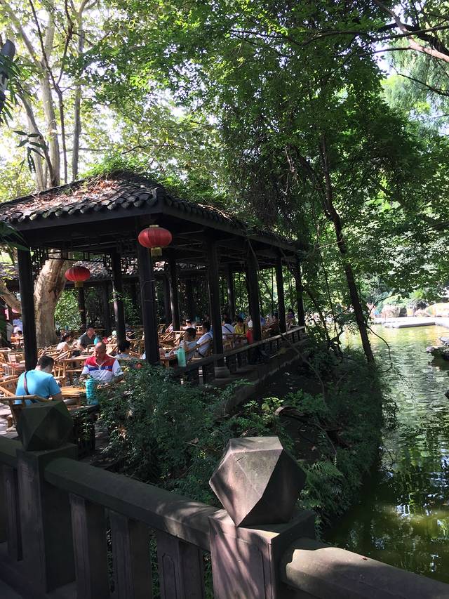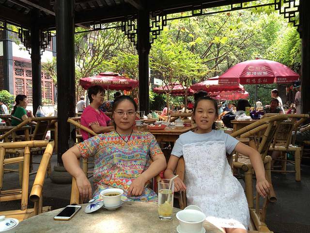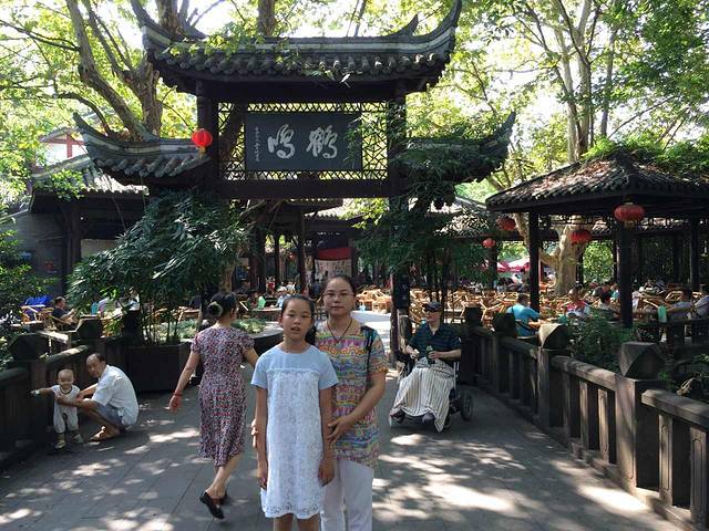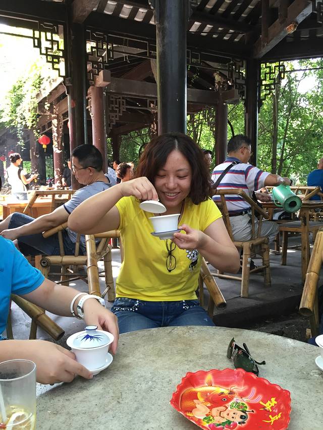 人民公园,百年鹤鸣茶社,成都悠闲的名片;春熙路,成都王府井,成都繁华的代名词。这两处地方闻名已久,且离我们居住的童话公寓不远,抬脚就到。人民公园一直是蓉城百姓品茶观景、游玩休憩,养生健体,流连忘返的好去处,身在其中,心情无比舒畅。成都人的生活就是这样不紧不慢,悠闲滋润。我们进了公园,简单转了转,就直奔今天的主题—鹤鸣茶社,喝茶是成都人的一种特别嗜好。成都茶馆不仅历史悠久,数量众多,而且有它自己独特的风格。无论你走进哪座茶馆,都会领略到一股浓郁的成都味:竹靠椅、小方桌、三件头盖茶具。这在鹤鸣茶社体现地最淋漓尽致,手托青花盖碗茶,坐在小河流水、青竹相依的公园绿色氧吧中喝喝茶,晒晒太阳,和亲朋好友摆摆龙门阵……这样的场景时常会出现在鹤鸣茶社。我们赶紧找了个方桌,点了几杯盖碗茶,时常茗上两口,在仿古的灰墙黑瓦中,在枝繁叶茂的参天大树下,在绿幽幽的湖水旁,拿上一副扑克牌,就那么惬意悠闲的享受这安逸的时光。俞先生还饶有兴趣地享受了一番古法按摩,真是舒适写意,仿佛时间就这么停滞了,成都的悠闲慢生活在一杯杯盖碗茶中演绎着。