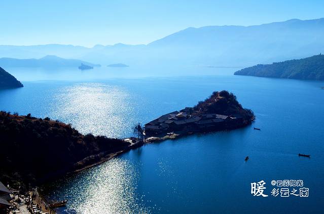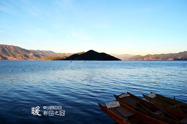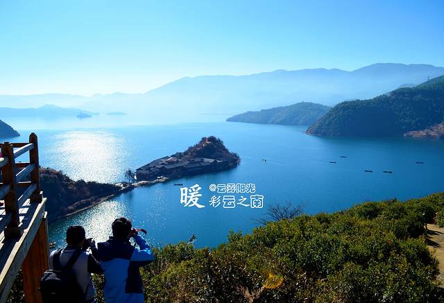 半山腰处有座白塔以及木板平台,这里就成了谋杀单反内存的绝佳场景。爱美的女生们自不必说,各种小清新无节操应有尽有,按就不往上放了,嘿嘿。更多的还是各角度根本停不下按快门的手的泸沽湖,时值10点多,刚刚好的阳光照在湖面,晴空万里的蓝天将湖面染成一片迷人的深蓝色,仿佛笼罩了天地间的一切,这场面真是醉了,太TM美了。