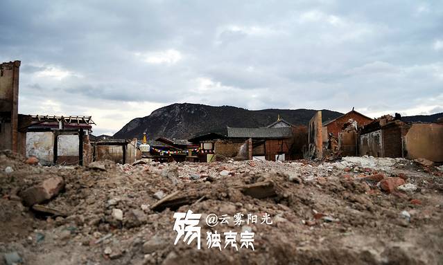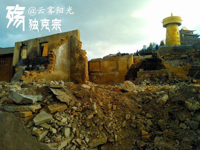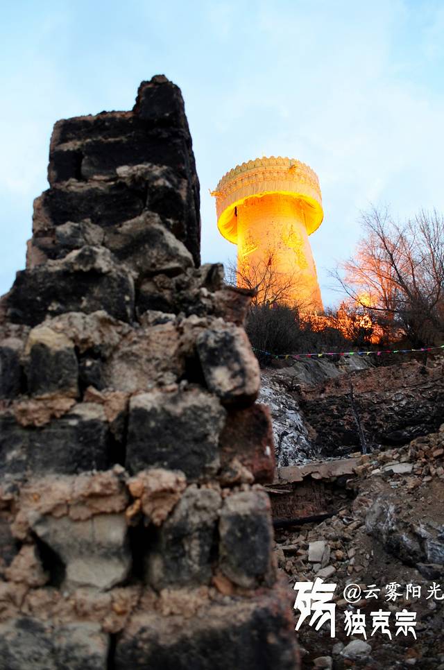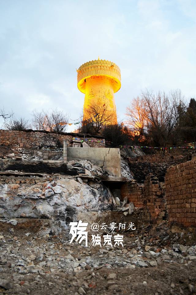 废墟在巨大的转经筒橘黄色光照的映衬下,更显凄凉。