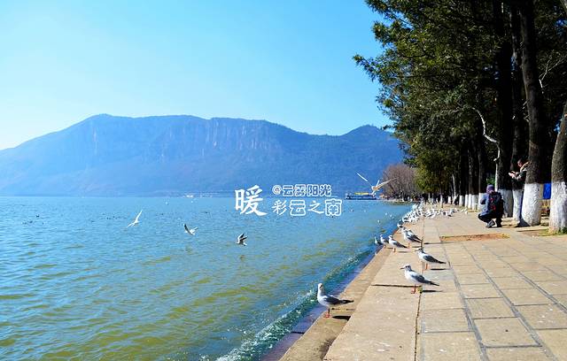 正值中午时分,公园里人不少。进入大门前行几十米,便能看到滇池。大片的红嘴鸥翱翔于滇池边,时不时啄食着人们手中的面包。海鸟出现在没有大海的城市中本是件新鲜事,不过据说这些鸟儿是来这里过冬的,开春就会返回北方。