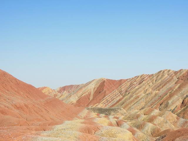 大概等了一个小时不到大巴缓缓开来,很轻松的到了七彩丹霞。门票和冰沟丹霞一样们,都是60元,包含了20元的观光车费。刚好是正午,太阳很大,很晒,七彩丹霞确实是有很多颜色,但是想要拍出图册上的效果,真的单纯的拍是拍不出的,后期的处理是必不可少,里面很大,走了很多路,因为光线等原因,觉得没有拍到好的东西,想等晚上八九点左右的日落,可以一来担心车一来WN说她晚上是夜盲,一担心,一狠心就就着最后一班汽车回去了兰州。但是这两个丹霞地貌,对于自己来说,觉得是不枉此行的。