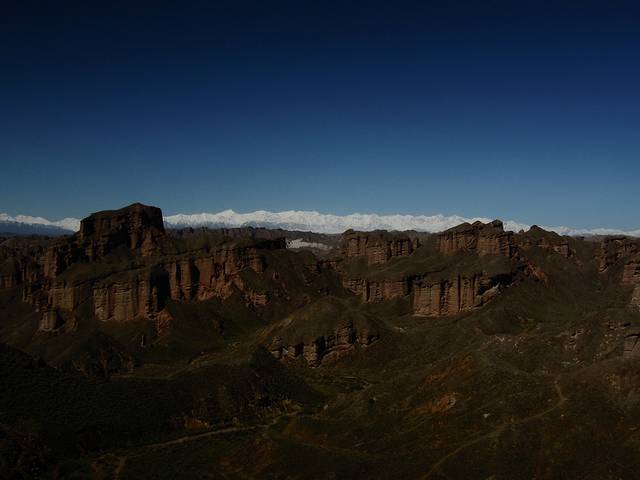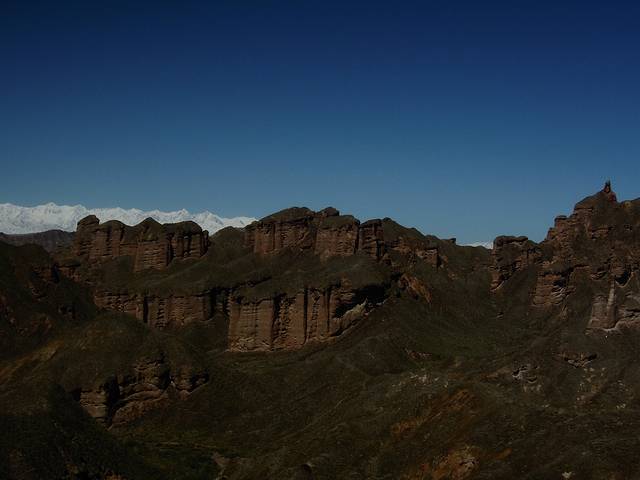 冰沟丹霞。后面的雪山,延绵不绝。站在高处,能感受雪山的冰艳。