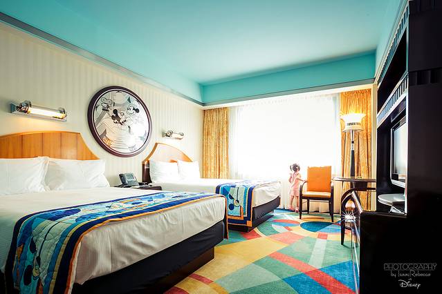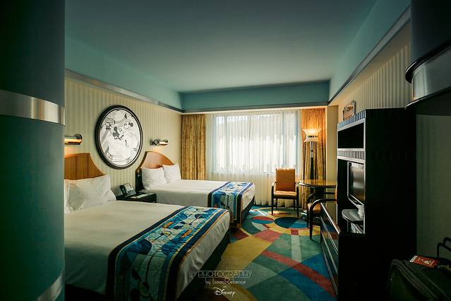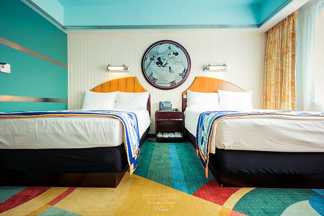 这是酒店的客房,很整洁,很古朴,墙壁上还有大幅的米奇画像,拖鞋杯子等也都是米奇类型的,且都可以拿走留念。房间是两张大床房,属于亲子房,可以同时入住4人。