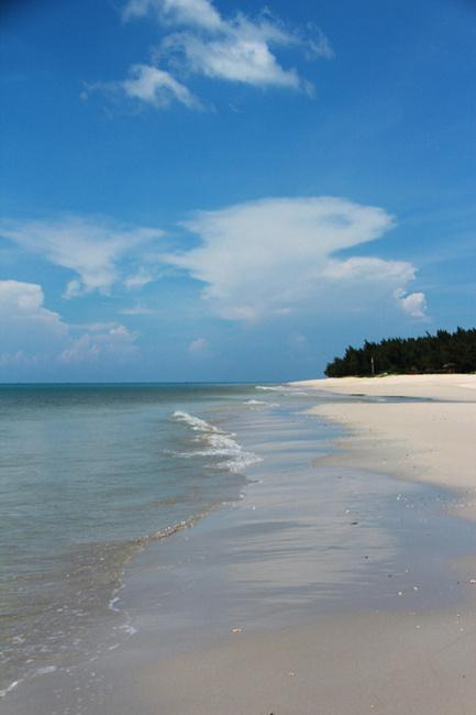 石螺口海滩和其它的景点都不一样,即有国内其它地方海滩的那种浪漫,又有涠洲岛特有的原始与自然。石螺口海滩的沙子漂亮且松软,在阳光强烈时很白,刺的人睁不开眼晴。天空与白云、海水与浪花、沙滩与茅草棚、渔船与远处的风景、戴着斗笠织网的渔民与躺在太阳伞下戴着太阳镜的游客,很自然地构成一幅无可言说的和谐景致。
