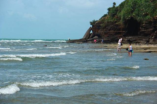 五彩滩,原名芝麻滩,因沙滩上有许多像芝麻一样的黑色小石粒而得名。退潮后的五彩滩格外漂亮,巨大的火山岩一层一层的,在阳光的照射下特别的壮面。大片大片的火山熔岩裸露出来,特别的宽阔。许多地方虽然海水退了,但还是留下了大片大片的一洼一洼的水,在蓝天的映射下,一洼洼水也变成了蓝色,和裸露的岩石一起,很是迷人。远处蓝蓝的天和蓝蓝的海水成了一色,白白的云点缀蓝蓝的天,让天空更生动;海水时而很温柔地亲吻着火山岩石,时而遇到岩石便跳跃起来,飞溅成白色的美丽的浪花。
