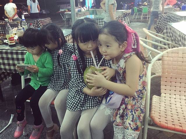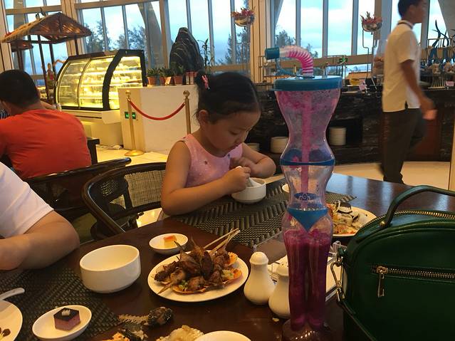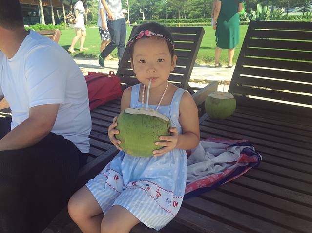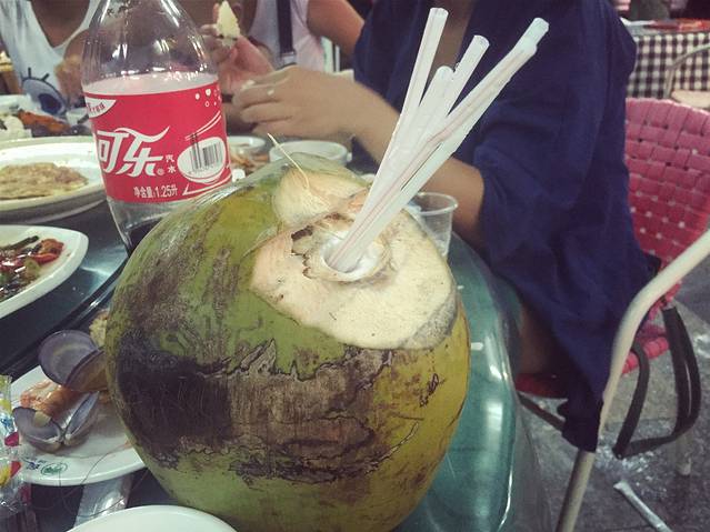 拿到行李后,松弟安排的朋友已经在门口等了好久了,再吐槽一下那个出行李也忒慢了!接到我们后,以为直接去酒店,没想到被安排了接风洗尘海鲜大餐,直奔三亚湾的一家夜市海鲜店,店名忘记了,这里没法说了。松弟喊了一帮朋友和家人来给我们接风,满满一大桌各类海鲜,真心好吃...平时不爱吃海鲜的我们赞不绝口!海边的海鲜和我们内陆地区吃到的差别太大了,怪不得之前一位厦门的朋友跟我说,不爱海鲜的人到了海边也会爱上海鲜的。口感特别鲜美,肉质弹嫩,我现在还在回味...口水...添宝想了许久的椰子汁喝了之后竟然说好难喝,哈哈,估计不够甜吧,其实我觉得挺不错的,椰子饭也好吃,虾子、贝壳类的还有蟹添宝吃了不少,很多种类我叫不出来名字...最亮点的是那条鳗鱼,据说200多一斤...