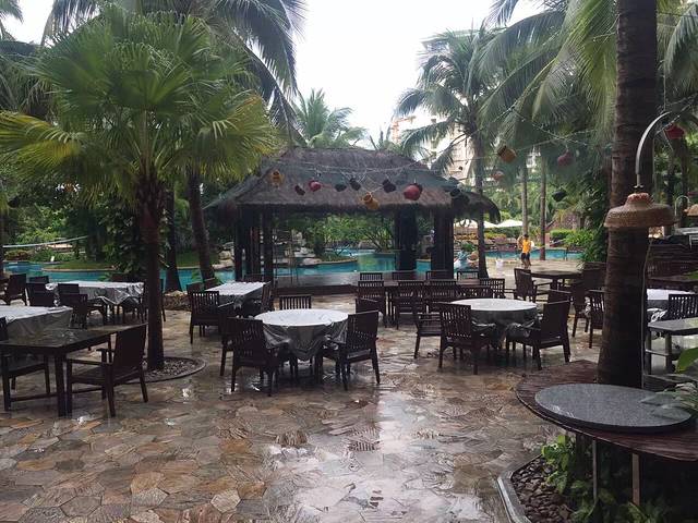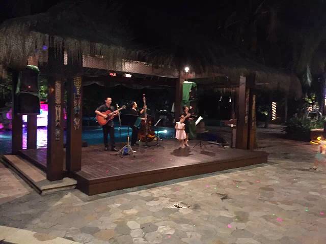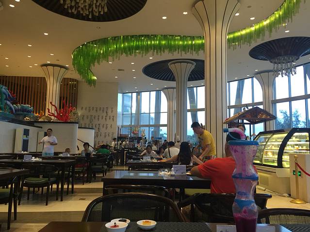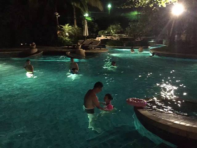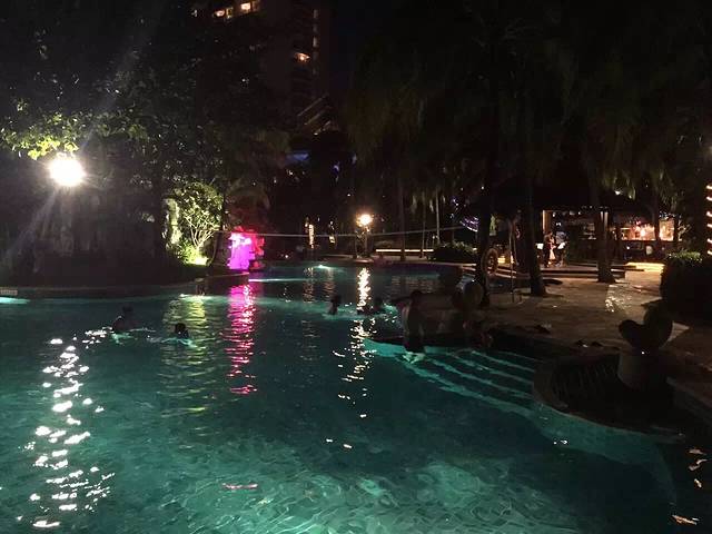 入住收拾完毕后,决定去对面超市逛逛,添宝吵着要吃方便面,我也想买点饮料零食消遣…超市好几层,类似于家乐福那种规模的,一层好多卖海南特产的,这是个正规超市,如果有需要可以买一点,放心购买。超市出来后,天已经黑了,在房间吃完东西后添宝着急的要下去游泳,换好行头下楼去喽…酒店泳池真够多的,好几块区域,不同深浅,还有儿童专用的温水池,赞一个!泳池旁边有露天自助烧烤吧,价格是两百多一位,还有乐队演奏助兴,唱的还挺不错的…这样的夜晚,这样的环境,还有好听的音乐伴着…让自己放空,可以彻底放松下来了…