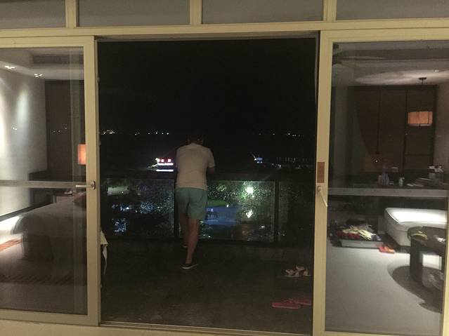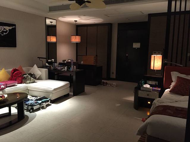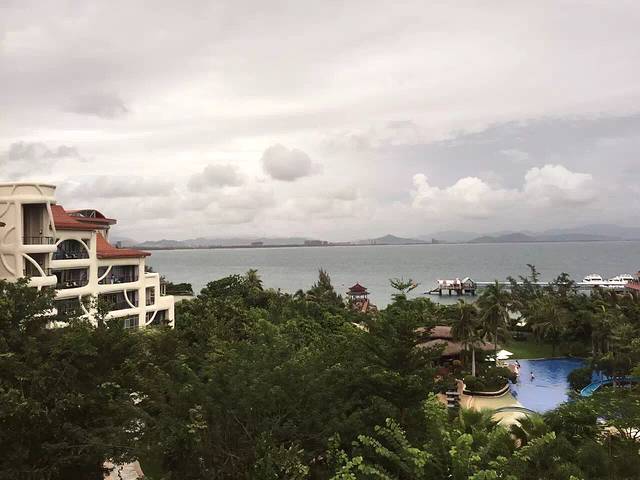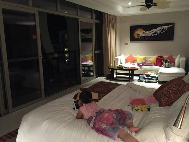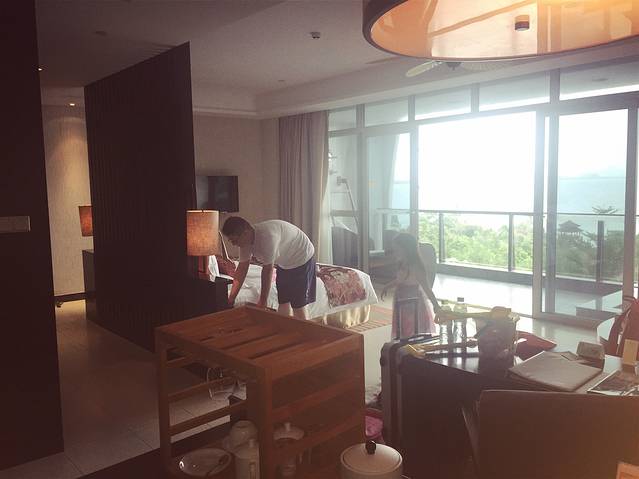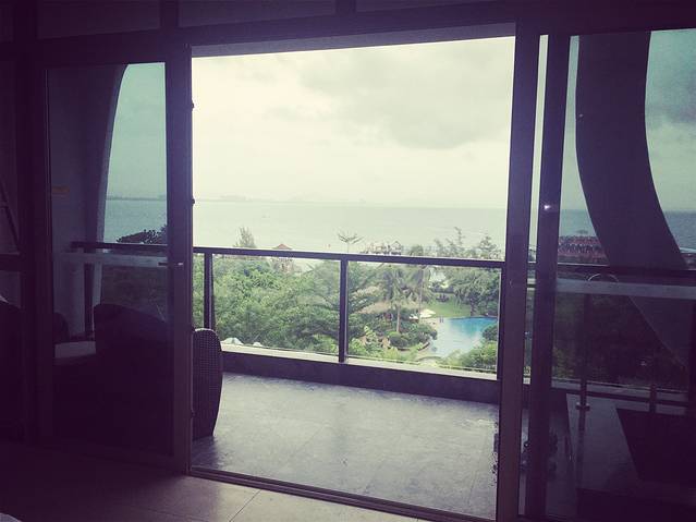 服务生帮我们拿行李带我们到了房间,并且给我们介绍了房间各项设施的使用方法,服务热情的我好想给他小费啊,还好忍住了,哈哈。阳台超大的,视角很广,这才叫真正的海景房。可惜天气不太好,照片拍出来比较暗,灰蒙蒙的。还有一个特别让人喜欢的地方就是阳台上的泡池,可以放热水的,添宝喜欢坏了。