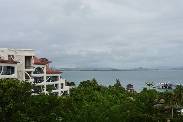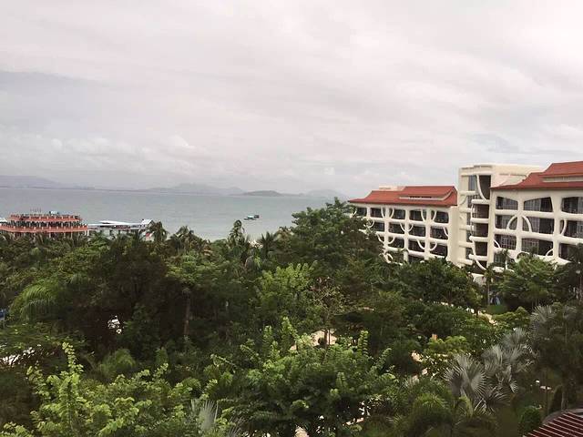 飞机到达三亚上空的时候盘旋了好久下不去,广播说地面天气不好,这个闹心的~我们来之前就听说台风来了,前一天还有飞机在三亚降不下去,飞到海口去了,我们不会也飞到海口去吧?不过还好,半个小时后顺利降落了,降落时已经是晚上七点多了。