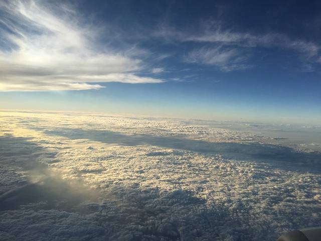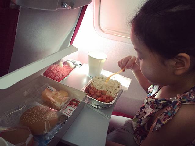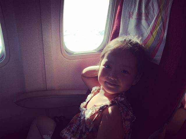 飞机竟然准点起飞,说好的经常延误呢?(偷笑)此次航班是一架中型波音737,我选座位选在了尽量靠前,据说靠前安全系数高一点,而且靠前避开机翅膀,噪音小一点。空乘服务还不错,就是脸上面粉厚了一点,其实长得不错滴~飞机餐还可以,比较清淡的那种,不过我这种重口味的人也在点心盒里找到了各种酱,包括海南黄辣椒酱,拌饭一级棒。添宝的餐是土豆烧肉面条,不过有点干,她并没有吃多少,小面包和饮料倒是很喜欢~平流层的云太美了,添宝一副惬意舒适的样子,会享受,这点像我(*^__^*)