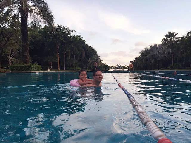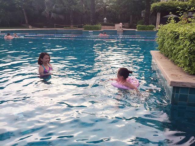 三亚不是热,是晒的让人受不了。亚龙湾玩了一会就感觉体力已经耗费大半,想回去休息了…松弟没空来接,我们自己坐的门口公交回去酒店。在房间简单吃好饭休息过后,傍晚时分一家人又去戏水了…享受最后的慢时光。添添回来合肥后最怀念的也是酒店游泳的时光…戏水能玩到天很黑了,添宝也不觉得肚饿。后来突然出现了一个俄罗斯小男孩,对添添说了一句中文:你好!我让添宝回答:hello!(我以为他金发碧眼是美国人…)结果那男孩没有反应…后来听见他和他妈妈的对话,这才惊觉原来是俄罗斯人…三亚游客东北的和俄罗斯的很多,估计冷怕了吧,哈哈。