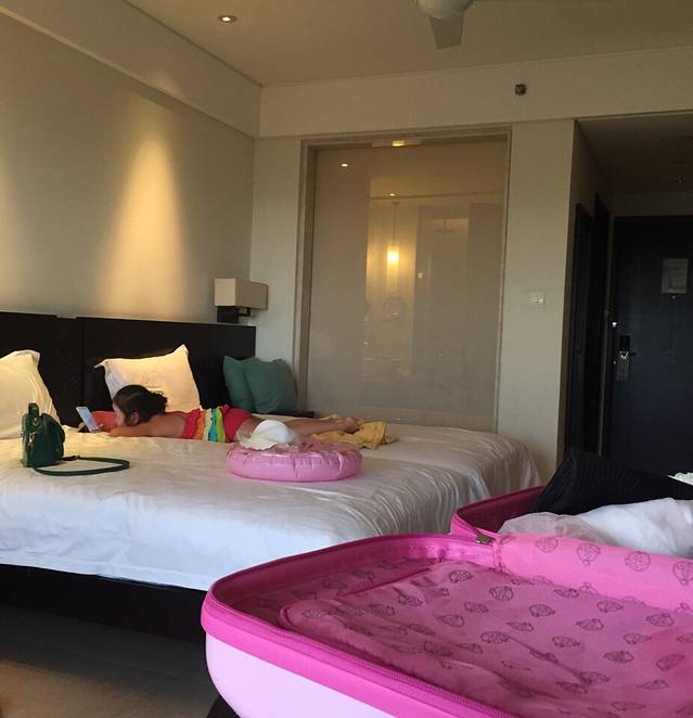 第一天晚上过度一下。提前一周在美团上定的特价自主大床房,才97元,自主大床房的意思就是没有洗漱用品,这个没有关系,我们向来是自带。到了之后很惊喜,酒店房间挺新的,很干净,房间虽然小,但是该有的都有了,如果只是简单住宿可以考虑在这里,非常划算哦~还有就是前台服务不错,让她给我预留一间安静点的房间,带小孩怕吵。到了之后真是一间很靠里的房间,赞一个!这个酒店在三亚湾,从机场打车过来应该是二三十块钱,另外由于提前美团支付了,该店不需要再交押金,需要交每人2元的城市建设基金。