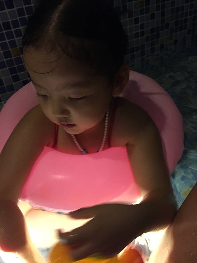 爸爸擅长游泳,会各种姿势。添宝让爸爸表演潜水给其他小朋友看,笑的咯咯的,很是得意。