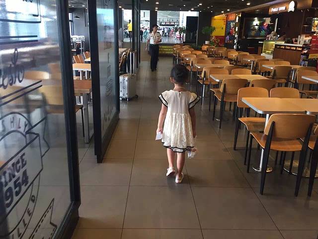 大巴一小时二十分钟到达合肥新桥国际机场。第一次来这个去年才建成的新机场,很高大上的感觉,哈哈,原来合肥的老机场太小了,这样的才叫机场嘛~ 选座位取登机牌还有托运行李都在一起,每家航空公司check in的口不一样,怎么办呢?还是那句话,问人!我们是海南航空的。选座位值机我已经头一天打电话给海航办好了,一般提前24小时之内都可以电话或者网上办理值机,具体的还是要咨询航空公司。行李每人可以免费托运20公斤,手提5公斤。如果行李有点重了建议在家称一下,省的到现场造成不必要的麻烦。液体类的只能托运,刀具火具不可以带,托运和手提都不可以哦~充电宝好像不可以托运,因为我不用充电宝,所以不太确定。机场提供免费开水和温白开,带个杯子给娃喝点水很方便,添宝第一次坐飞机,第一次跟我们一起长途旅行,一路很兴奋,自己推行李箱,自己办理托运,那生活自理能力简直杠杠的!(*^__^*) 办完手续剩下的就是等待了,添宝吃点东西坐着行李车到处转转打发时间了。也有不少餐饮店,我一眼先看到的是KFC......