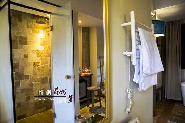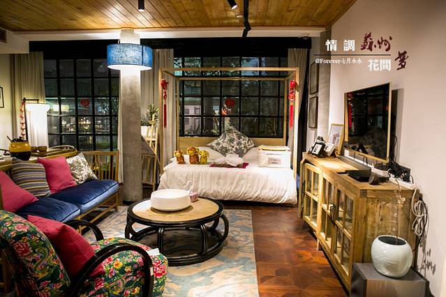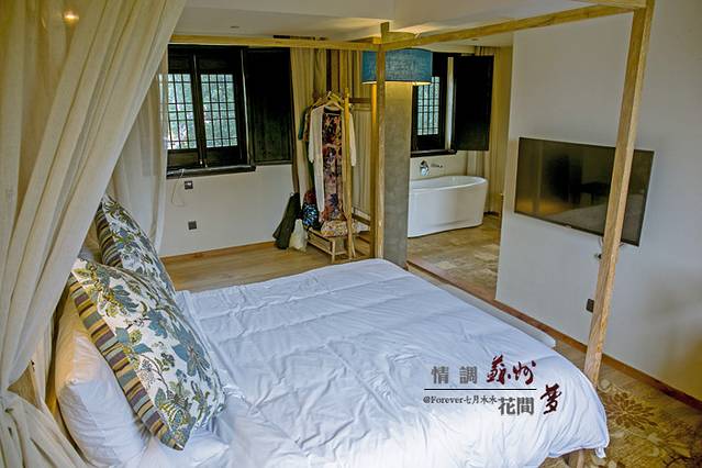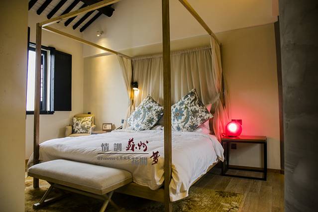行走在客栈里,就像走过苏州的寻常巷子人家,白墙,黑瓦,花窗,第一天入住的是阊门人家,我想这个名字的意义这大抵上是因为这房间,推开窗户,便能远远得望见老阊门。房间位于2楼,传统的木制结构结构粗线条的白墙,简约而不简单。木框架的床,两边用薄薄的纱做了间隔,使得这简约的床更富有情调。