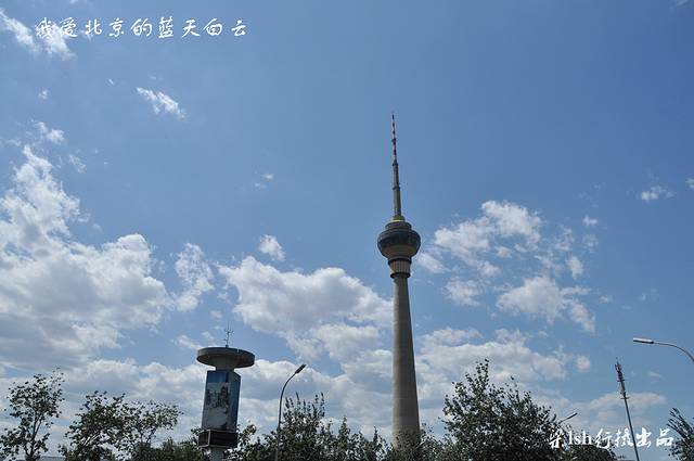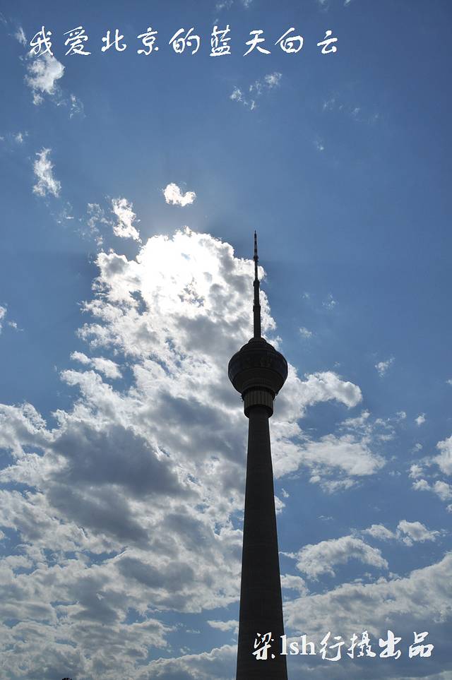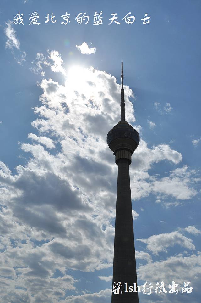 北京的地标之一,中央电视塔。蓝天白云映衬下,电视塔高耸入云。