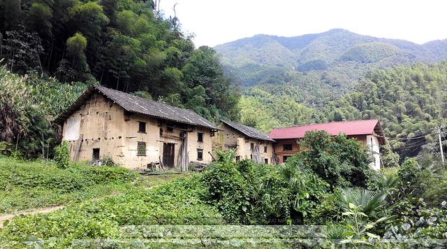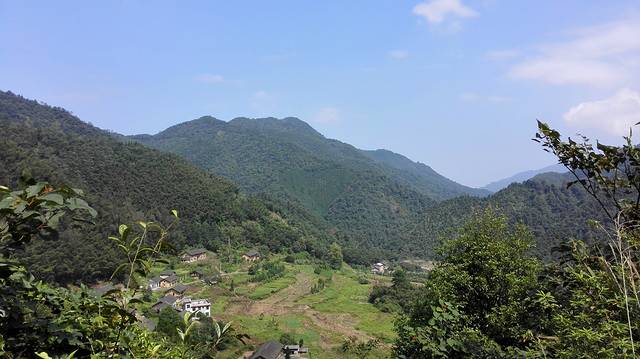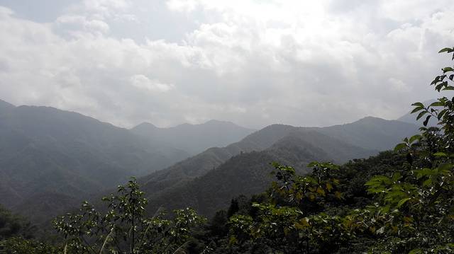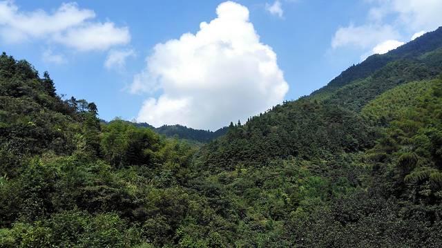 3公里后到塘溪村,顺公路上山,这是路上的第一座山,不高,600米的样子,但渐渐直射的太阳让人无处躲藏,一路晒腊肉。又5公里后上到山顶,此时为10点半,速度保持得不错。过了山顶,山那边的群山显露出来,雄伟!太阳作用下的热气弥散在山谷,山有些灰蒙。下小溪组这却是异常明亮,蓝天白云屋舍历历在目,逗比的是对面山上居然有好事者栽出一片心形的新树林来,何人有如此情调?哪个姑娘能受得了这种骚扰?