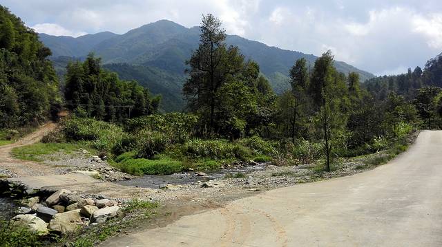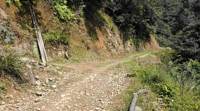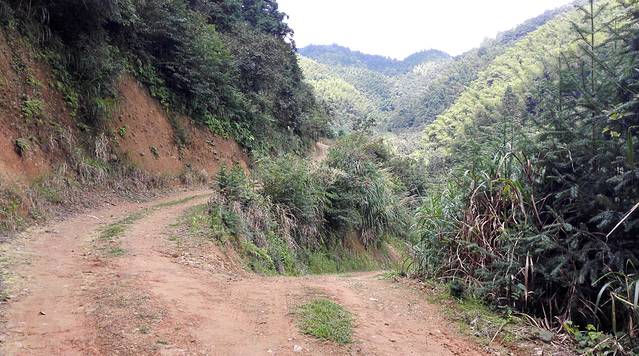 个把小时后有台摩托追上来,拦下来问,路没错,得知往上有岔道,左通小东江的五号桥,右到大坝。谢过摩托兄,过了几座黄泥老房子不远,便到了岔路口,想了想,选择了右手边这条,理由是这条路长得好看一些。