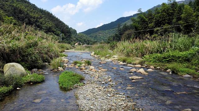 又2公里后下到山底的两江口,在路边的农家乐歇了会,与店老板聊会点,补充了杯水,继续出发,这离小溪村还有5公里,小坡,一路有溪流相伴,树荫多起来,路边隙谷常有清凉山泉流下,随地濯手洗脸,走起来轻松。12点到小溪村口前,这有一条分道拐左跨溪而过,估计是上山的路。此时肚子饿了,在溪边找块树荫饱餐一顿,抖擞精神开始今天真正的挑战,山远远的高高的在那里,前方一切都是未知数,因其神秘而兴奋。