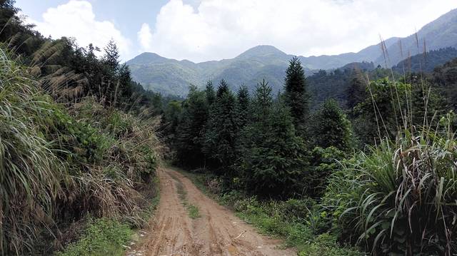 过岔路口后,水杯告罄,前面又有户人家,是朱老哥的府弟,他让出条凳先让我坐下,再把茶壶端出,不急走,喝点山中粗茶休息一下聊聊天多好。朱老哥今年60了,看上去精神得很,好山好水好空气就是好哇。朱老哥说,从小溪村到这,约9里地,再往上到顶还有3里地。不过上面没修大路,小路也有米把宽,虽然杂草蔓生,但走不妨。上面仍有个岔路口,指向一样,左边往小东江五号桥,右边往大坝。这次我选的是左边这条,理由是这边近。