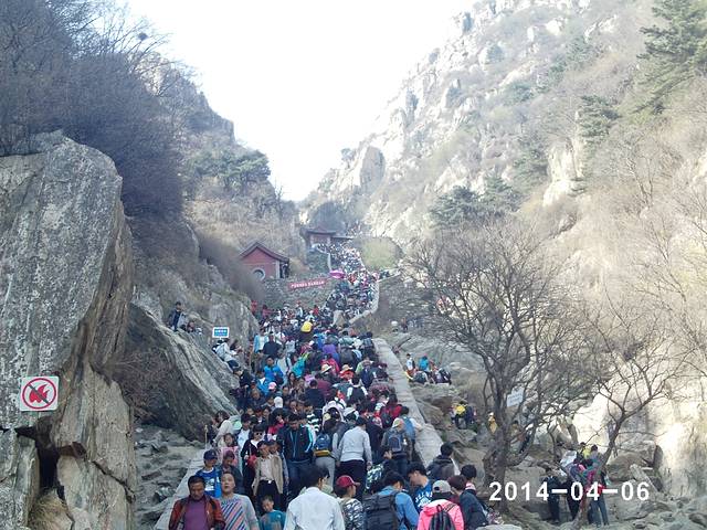 当晚11点到的泰安,清明节人太多,结果去的太晚住宿被取消了,只能硬着头皮去到泰山底下,一直到凌晨都没找到住的地方,结果一个在泰山底开按摩店的让我们睡他的店里,价格和外面酒店差不多,设备也挺好,所以逢节假日去一定要确定好酒店,差点露宿街头。(ps:1.绝对不要在火车站买拐棍,10块,20块都有,泰山脚只要2块!!2.我们第一天没休息好所以没打算看日出,第二天一早才爬的泰山)由于本人是高原的,爬完泰山只有一个感受,不是高,而是远,再加上清明节人多,排队累,爬的时候也累,但不用担心掉下去,因为你前后左右都是人,阶梯太多,以至于本人后来都不想再爬楼梯,所以一定要休息好!水也不必带多少,到一半你肯定会想连包丢了,不过山上的东西确实是贵,我们用了一整天爬到顶,早上八点去的,下午4点开始折返,由于6点回山西的火车,所以中途就坐了车下来了,索道绝对排到天黑!