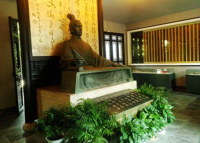 转过影壁墙,即是贾太傅祠,里面供奉着贾谊铜像及其著作。贾谊雕像裾席而坐,手握毛笔,凝神远望,似在思虑疾书。