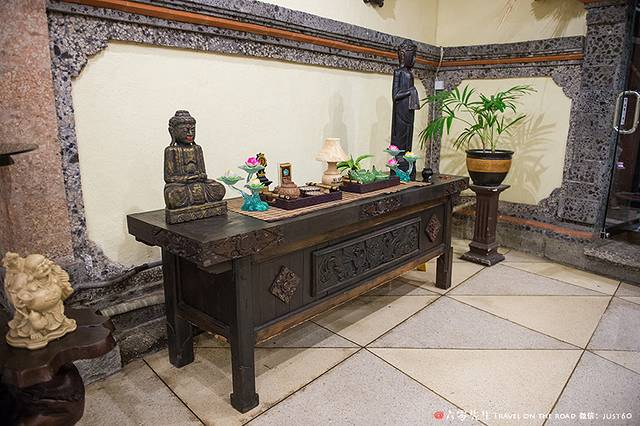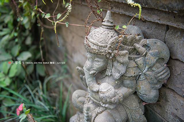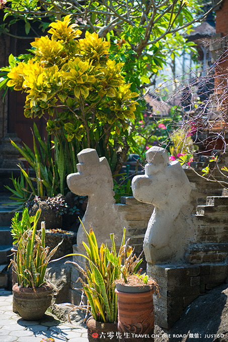 彩绘雕花的木门、石雕、还有各式精致生动的木雕,庭院内随处可见各种巴厘岛艺术摆件和绘画。