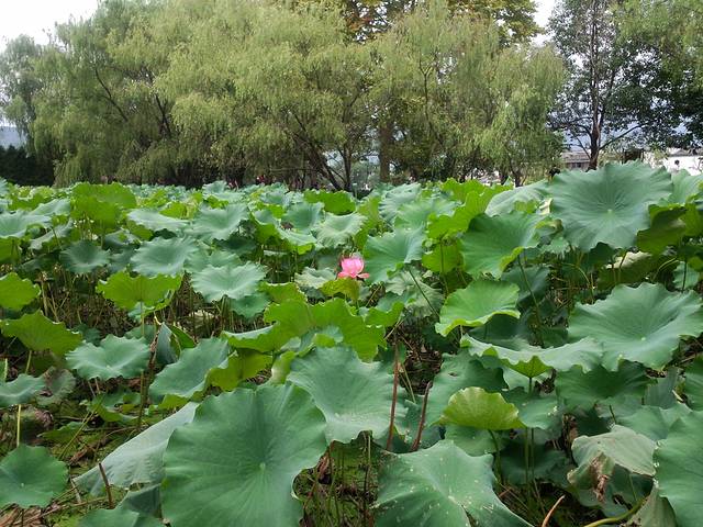 检票口旁边的池塘,万绿丛中一点红!