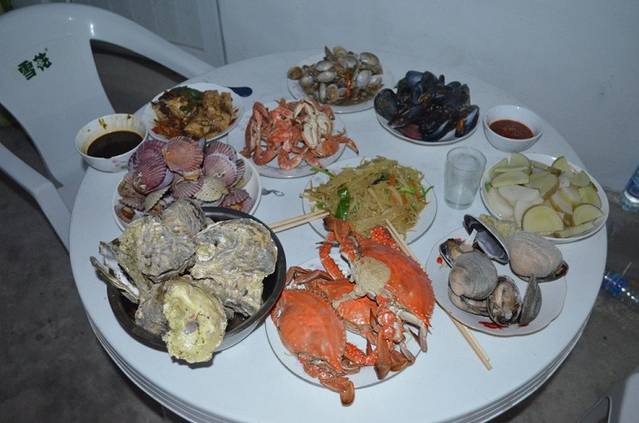 回到渔家乐旅馆,晚饭已准备好了:清蒸牡蛎,海虹,小扇贝,赤甲红,大飞蟹,大白蚬子,花蚬子,红烧偏口鱼,炒土豆丝,清蒸萝卜片。其中大飞蟹和偏口鱼是自费的。