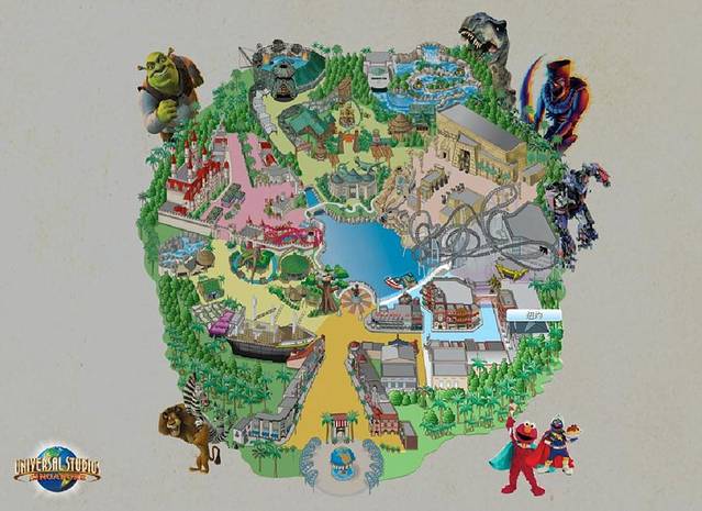 好莱坞(Hollywood)、纽约(New York)、科幻城市 (Sci-Fi City)、古埃及 (Ancient Egypt) 、失落的世界(The Lost World)、遥远王国 (Far Far Away)、 马达加斯加(Madagascar)