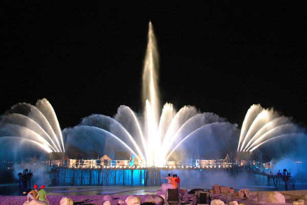 每晚金沙门前的海边有音乐喷泉表演,同时金沙酒店顶楼会有激光射灯表演。一晚有3场的。远处大榴莲的海边是欣赏激光表演的好位置,而想看喷泉的就在金沙前面的海边占位就行了。