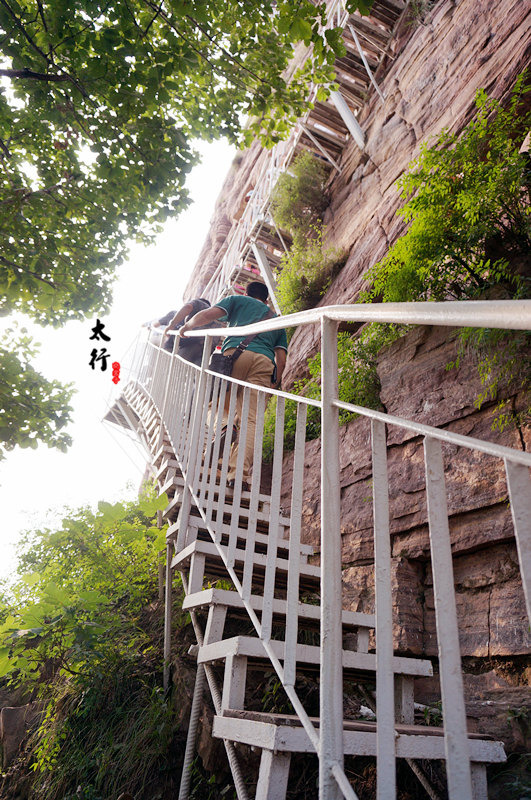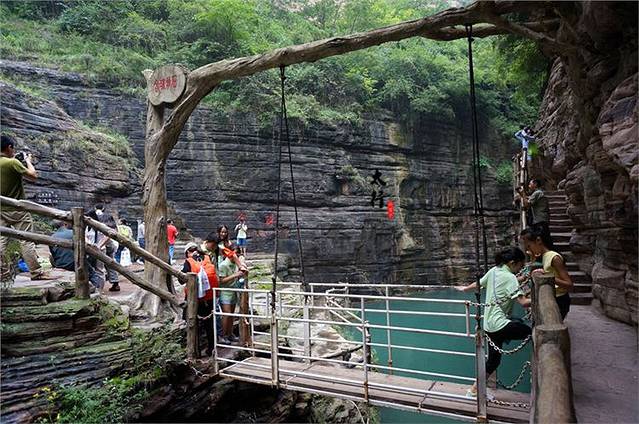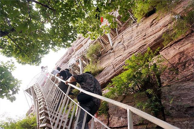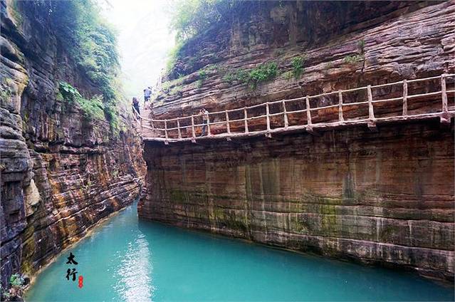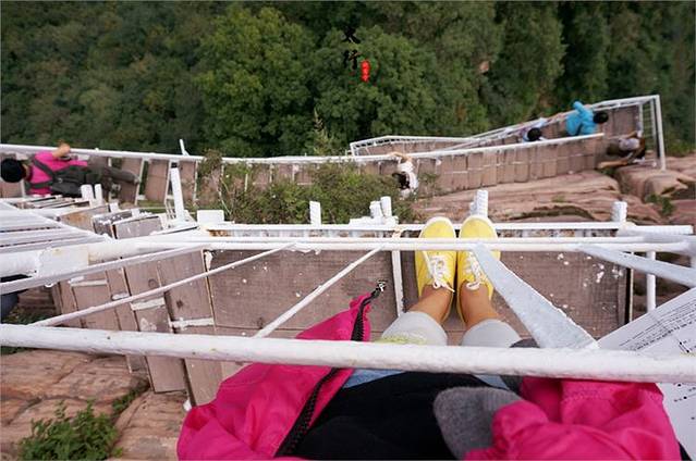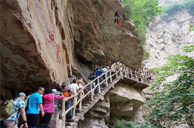悬空栈道,悬崖峭壁上凿出来的,走在上面往下看不免会心惊胆战。