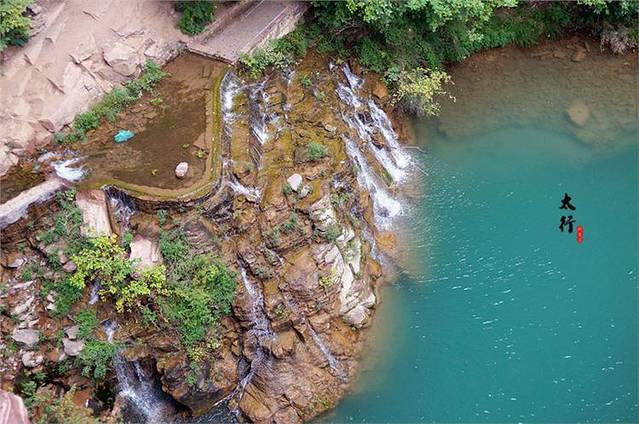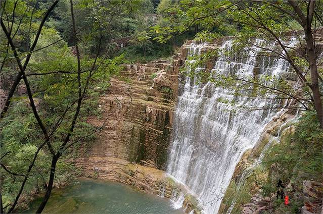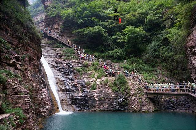 走进峡谷不远,就见桃花潭,清澈碧蓝的潭水,一弯三折从上而下的瀑布