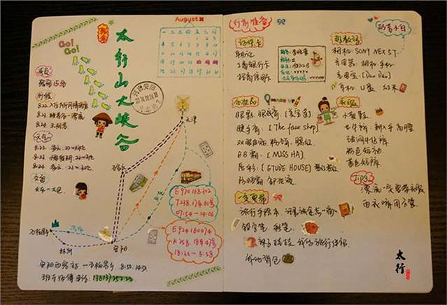 喜欢用手绘的方式将行程路线、吃、住等画在旅行本上。