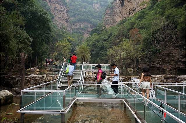 玻璃栈道,下面是峡谷溪水,清澈,水草绿油油