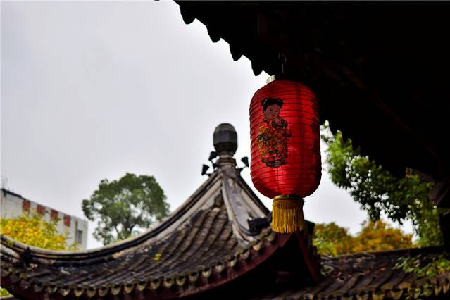 屋檐上挂的大红灯笼,给这个阴雨天气添了份喜气
