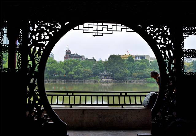 湖分前湖和后湖,湖中有洲渚。洲上多亭阁。前湖月堤上“浣月洲”居全湖中心,后称“樵云阁”。其南又有湖中洲。洲上建有“湖心亭”。亭阁三层,飞檐八出,高瓴流瓦,翘角滴翠,气度宏伟,构造精巧,为全湖览胜之佳处