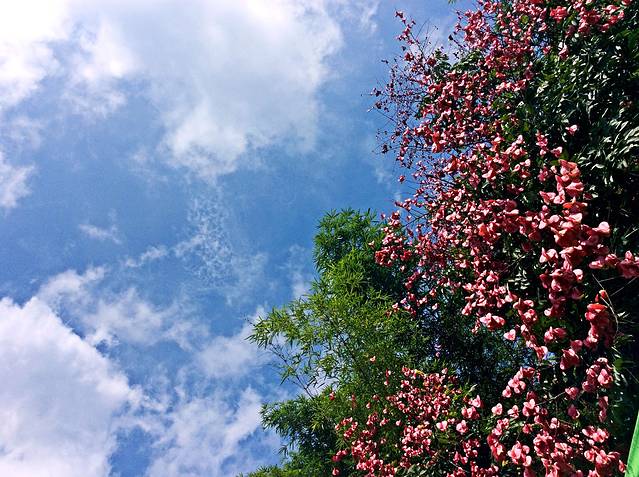 其几天都是阴雨天气,今天要离开了,天气很好,去打包了几个艾叶糍粑,路上当午饭。还是在景区门口坐车到贺州。候车区,有一颗树,开了很多鲜艳的花朵,一开始还以为是假花,走进仔细看,是真的。很漂亮。出客栈的时候,带走了几张客栈出品的明信片。