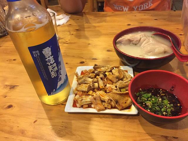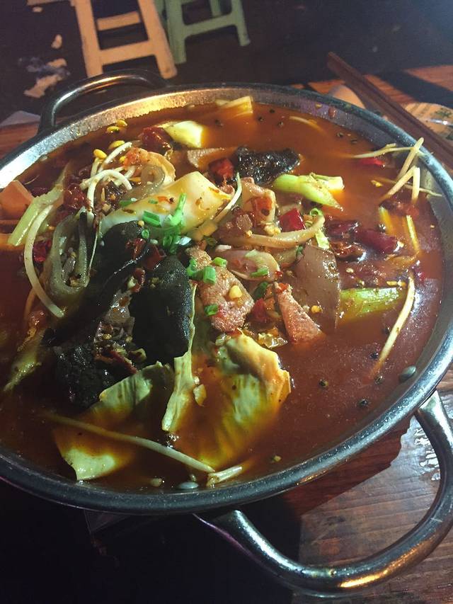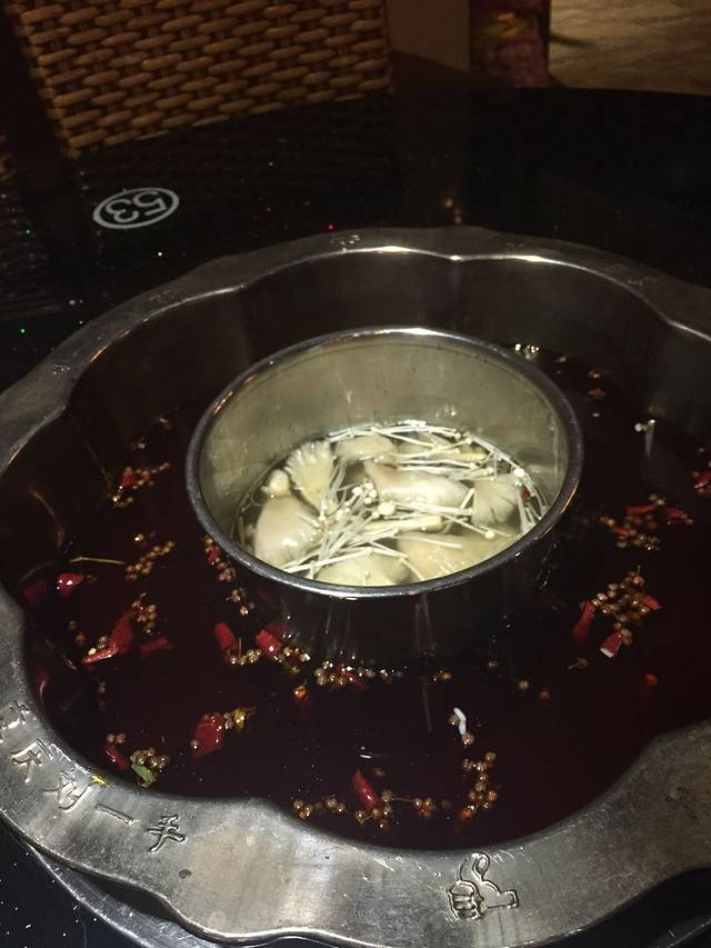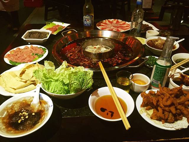 然后我们打车(10元)去了巴蜀大宅门火锅,到了之后取号排队,排队的时候我和大亮亮就把兔头解决掉了,哈哈,实在是太想吃了~好不容易排到啦,一进去全是人,当然,还有各种美女,亮哥看的都停不下来了~第一次吃成都火锅,这边是沾着香油,里边加蒜吃的,味道爽歪歪了,亮哥被辣的脸都成了猪血色了,依然吃的停不下来!我们两个人点了好多,才195,我觉得不贵,重点是味道实在是太棒了!!!推荐鸭肠、牛肚,他那儿还有个酸梅汤冰粉,非常好吃又解辣,严重推荐!