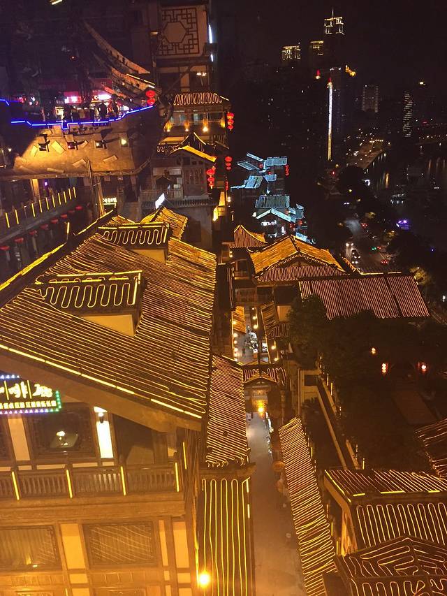 离解放碑不远就是洪崖洞,我们去的时候已经很晚了,大约九十点钟了,那里的商铺基本上都关门了,不过洪崖洞真的是个很奇特的地方,我们一开始在4楼,就是平地马路,后来我们坐电梯到了11楼,还是马路。。。我都晕了。。。在那逛了逛,拍了拍照片,我们就走啦,本来准备最后一天再来的,可惜没有时间了。。。