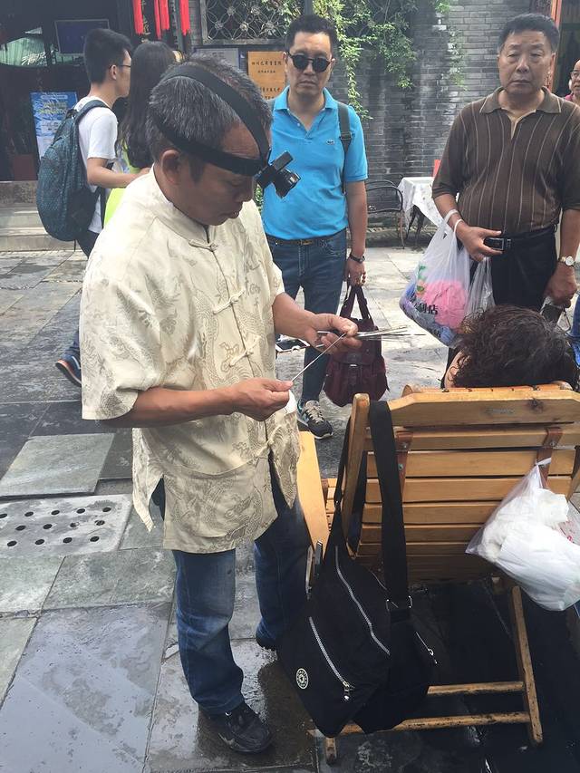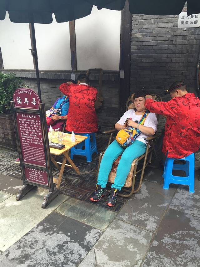 宽窄巷子里边掏耳朵的,一个人60块,我和大亮亮也试了试,一个人也就5-10分钟,贵呀!!后来打车听司机师傅说,他们在江边掏耳朵也就5块钱。。。被坑了!!