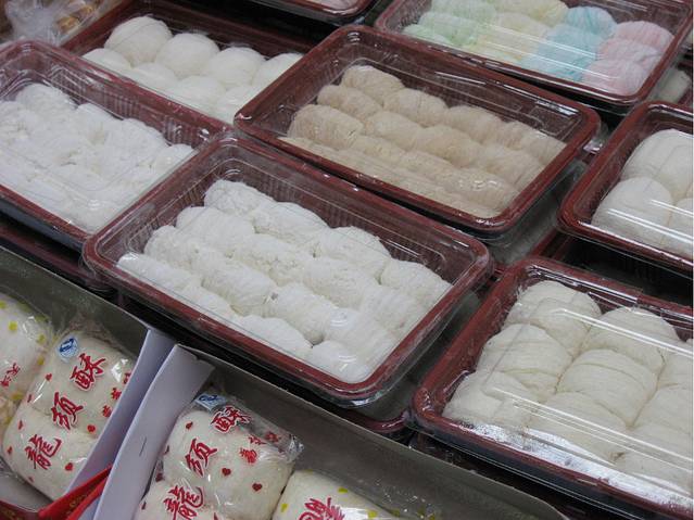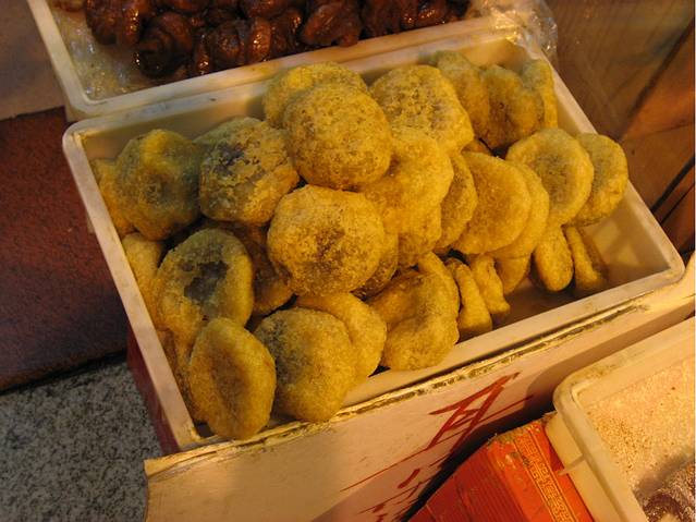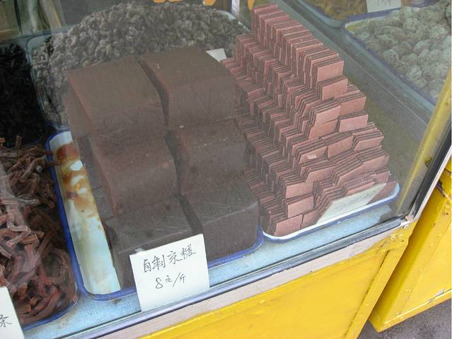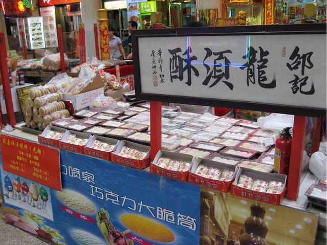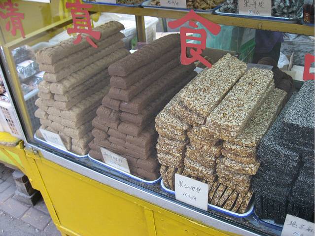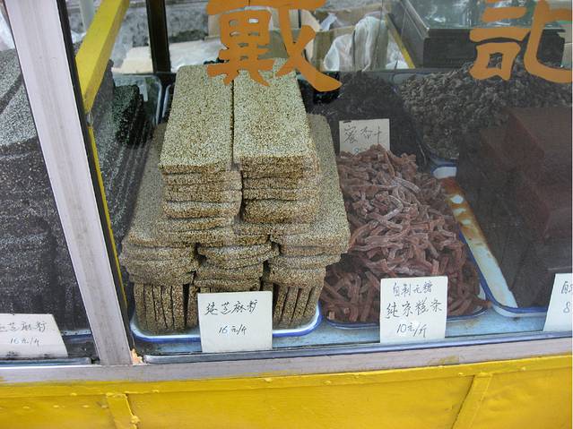清真南大寺牌坊下边食品车卖的清真小食品,品种繁多,有好些我都没见过。这是各种南糖。