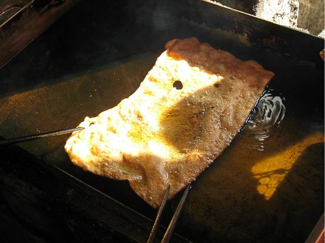 油饼?不太像,太薄了,炸得倍儿透,酥脆酥脆的,一咬都掉渣儿,1.5元一个。没准是馃箅儿(北京叫薄脆),太香啦,就是貌似油大了点儿,不太符合现今的健康饮食标准,不能天天吃,但是可以一周吃三次嘛!