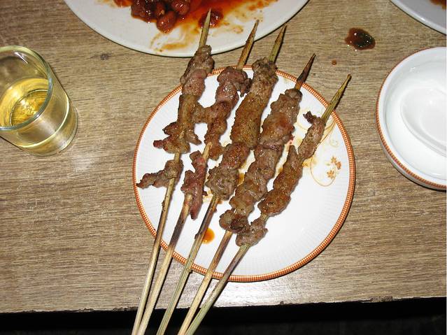 从旁边的羊肉串摊儿点了几串羊肉串(2元一串),是新疆小伙子烤的,味道挺好的!要是肉块能再大一些,就好啦!