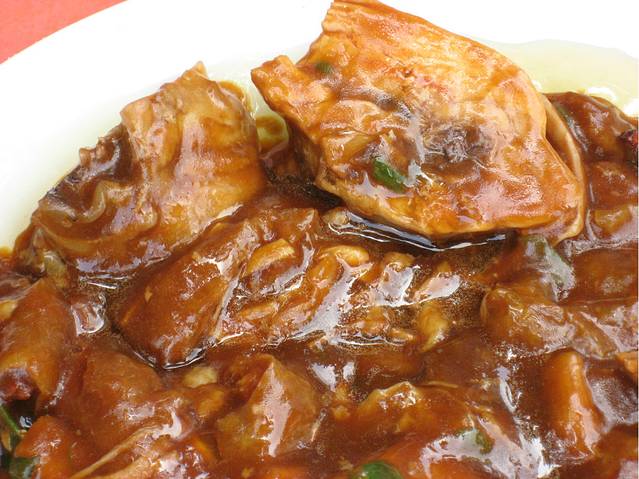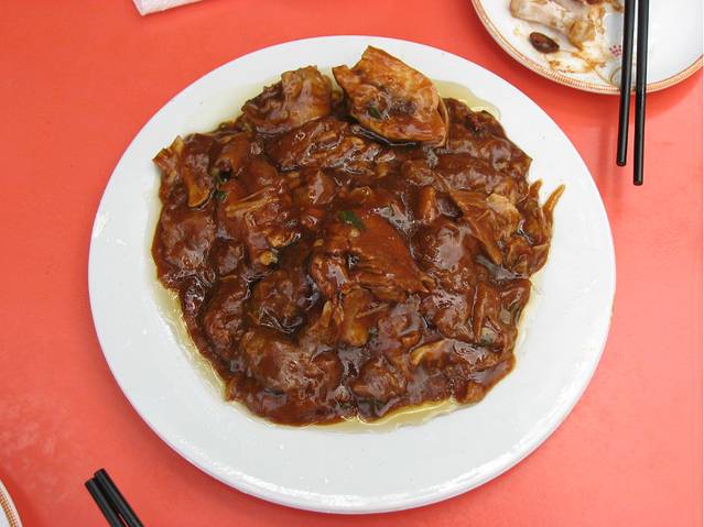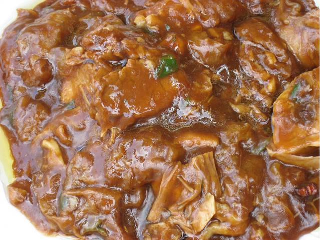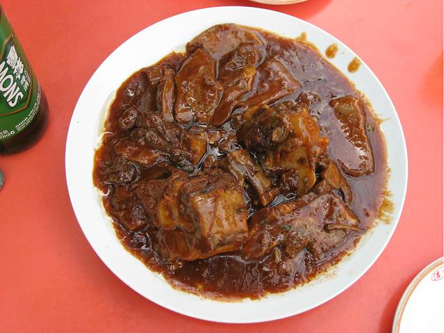 这是羊肉和面筋,炖得有些烂,分不太出来啦,但特别入味,用来拌米饭绝对不输给红烧舌尾的汤,可惜我们已经被红烧舌尾的汤拌米饭给喂得饱饱的了,只好下回再来吃了。其实我们本来是想除了点一道肉菜红烧舌尾外,再点一道半素的菜的,就是因为听服务员说炖三样里有面筋,就点了它了,没想到面筋只是一个小小的配角。看来“想当然”是绝对要不得的,大家一定要以我们的教训当做前车之鉴呀!