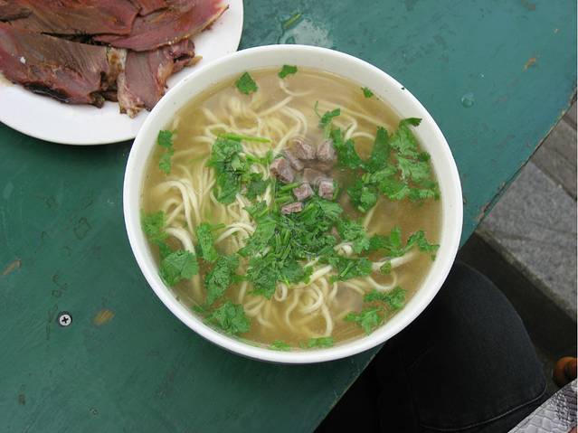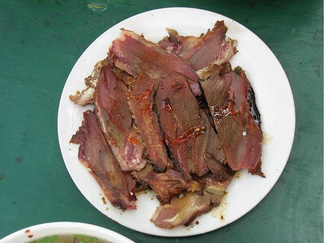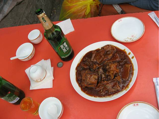 因为看着面上撒的是肉粒,怕紫檀吃着太素,喵喵特意点了一盘牛头肉。瞧这牛头肉,颜色红润,有筋有肉的,价格10元,点上几滴红油,香!要是配上瓶凉啤酒,那就绝啦!